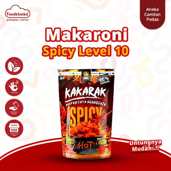 Kakarak - Makaroni Spiral Rasa Extra Pedas Level 10 adalah camilan makaroni goreng berbentuk spiral dengan tingkat kepedasan ekstrem bagi pencinta sensasi pedas sejati. Dibuat dari bahan berkualitas tinggi dan bumbu pilihan, menghadirkan kombinasi kerenyahan dan rasa pedas yang menggugah selera.