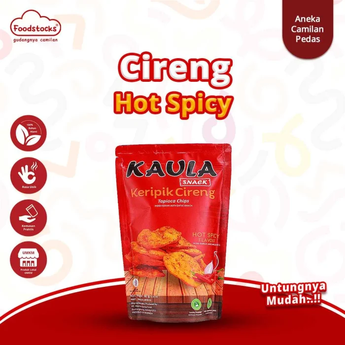Kaula Snack - Keripik Cireng Tapioca Chips Rasa Hot Spicy adalah camilan renyah berbahan dasar adonan cireng asli, diolah secara modern menjadi keripik yang garing dan menggugah selera. Dipadukan dengan bumbu hot spicy yang intens, cocok bagi Anda pencinta camilan pedas.