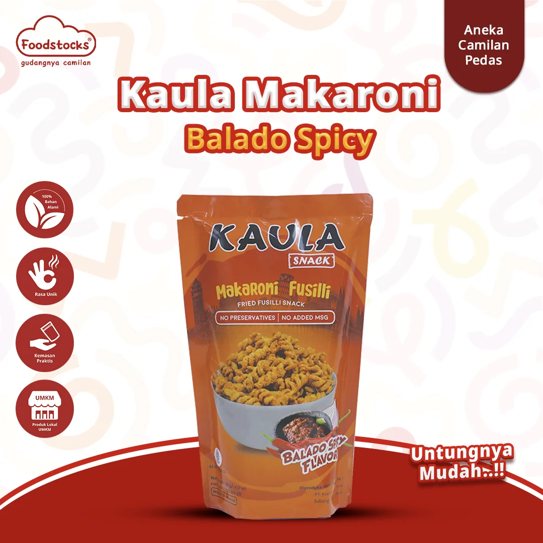 Nikmati sensasi gurih pedas yang khas dengan Kaula Snack - Makaroni Fusilli Balado Spicy. Terbuat dari pasta fusilli berkualitas, dibumbui dengan racikan balado spesial yang kaya rempah, menghasilkan cita rasa yang menggugah selera.