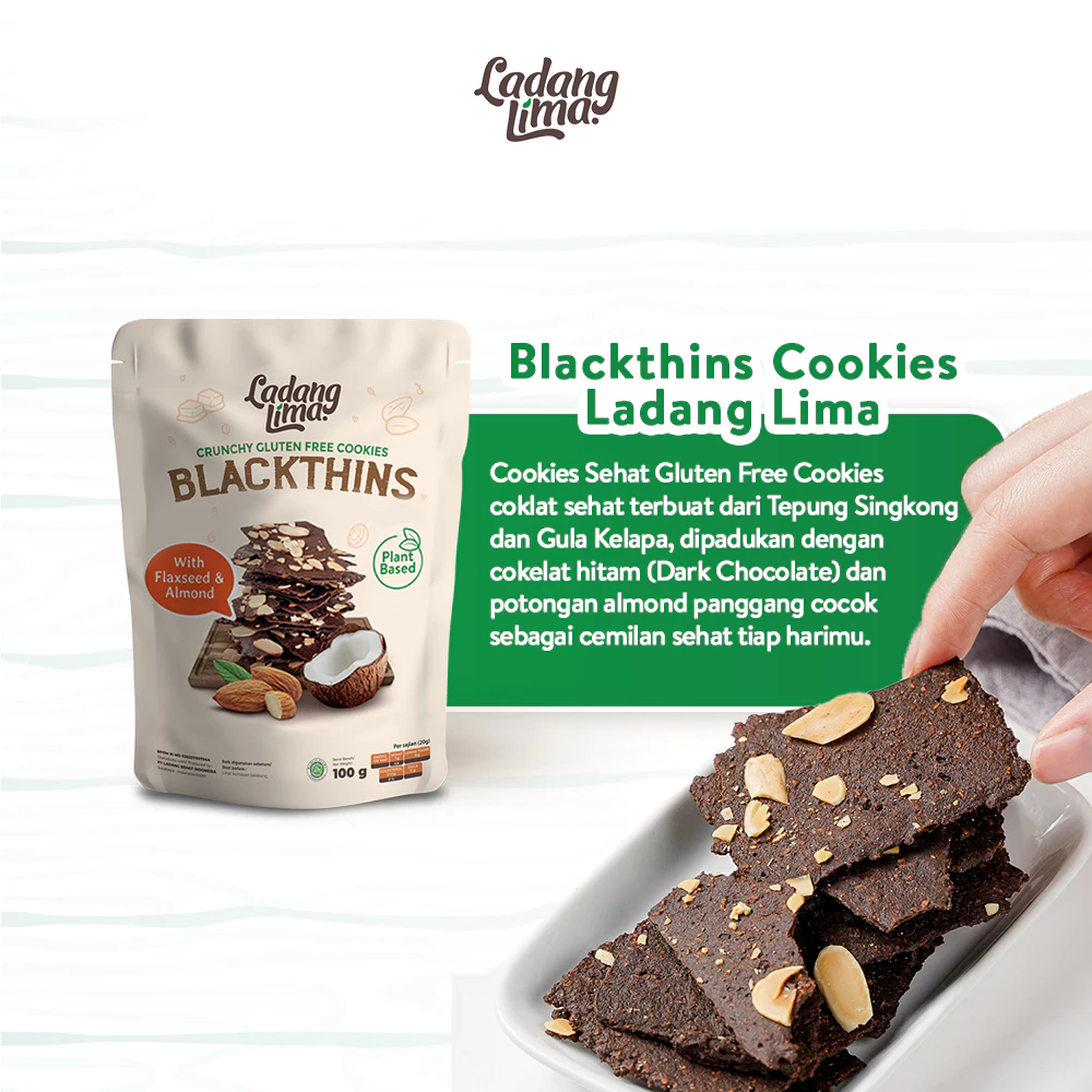 Ladang Lima - Blackthins Cookies 100g merupakan camilan sehat bebas gluten berbahan dasar tepung singkong Ladang Lima bebas gluten, gula palm, remahan kelapa, serta taburan almond panggang yang menciptakan kombinasi rasa yang manis dan crispy di setiap gigitannya. Teksturnya ringan dan renyah, cocok untuk Anda yang ingin menikmati cookies lezat tanpa rasa bersalah.