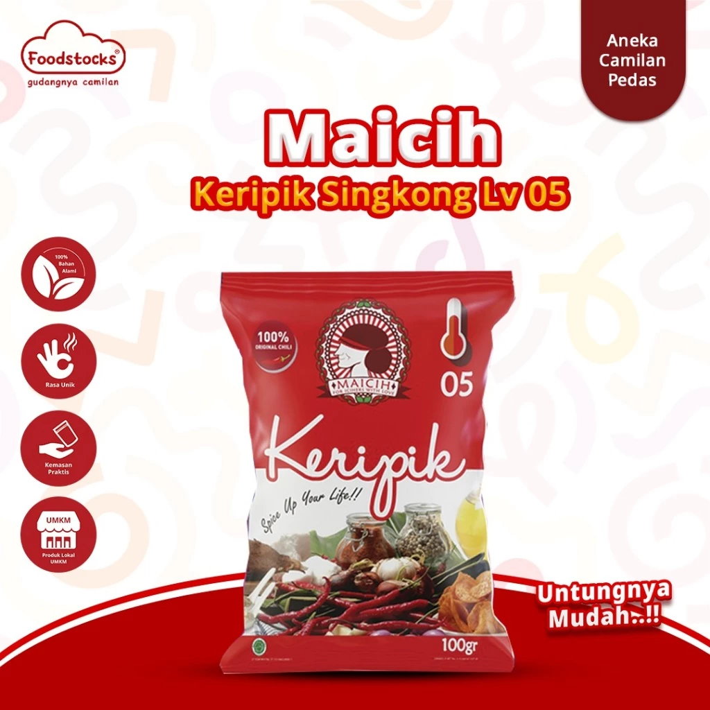 Keripik Singkong Maicih Level 5 khusus buat yang menyukai sensasi pedas tapi ingin menikmati keripik maicih dengan level yang menengah. Keripik singkong maicih merupakan keripik yang tipis dengan tekstur yang renyah lalu ditaburi bumbu spesial maicih yang terbuat dari bahan-bahan pilihan berkualitas tanpa bahan pengawet yang dikemas secara modern menggunakan kemasan alumunium foil.